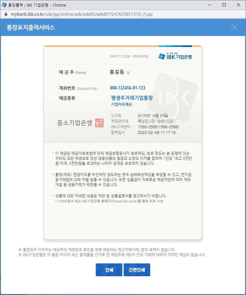 기업은행 통장사본 통장표지 출력하기
