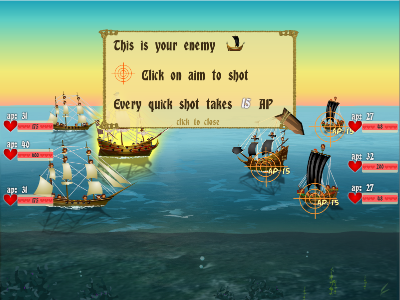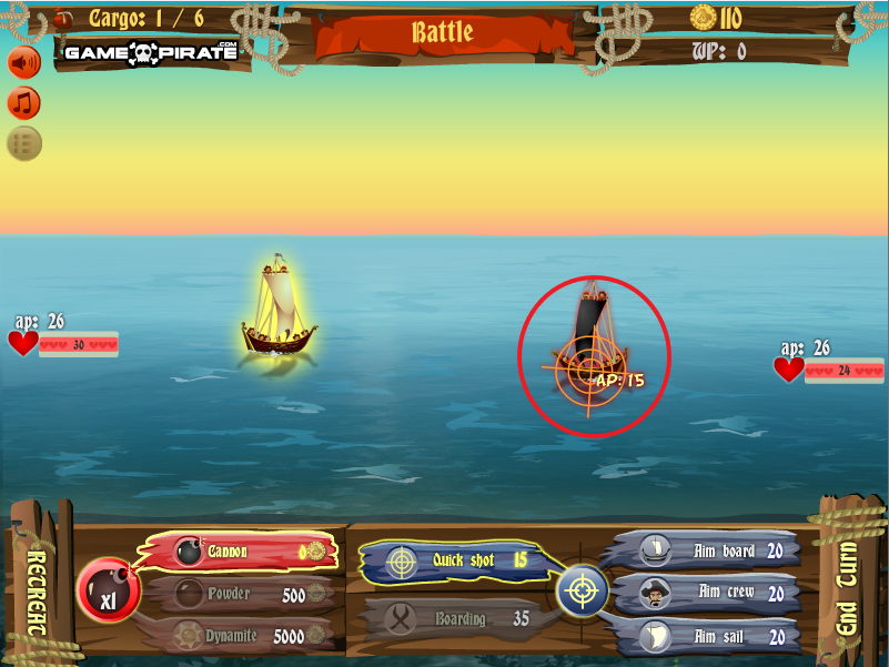 이미 강화된 배들이 지급이 되며 클릭하여 적을 공격해봅니다.