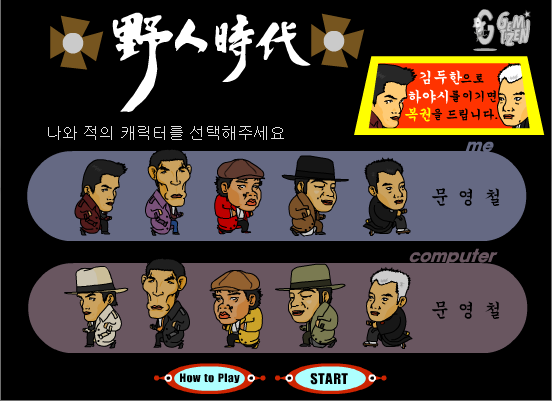 야인시대(野人時代)는 캐릭터를 선택하여 상대방과 대전을 하는 게임입니다.