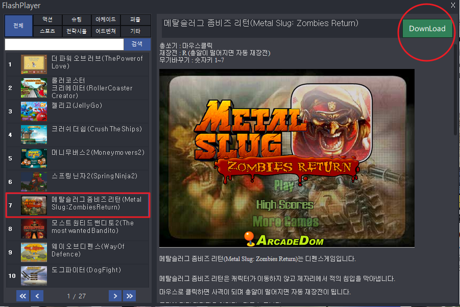 아래의 이미지는 플래시플레이어 설치후 게임을 찾은다음 우측의 download를 누릅니다.