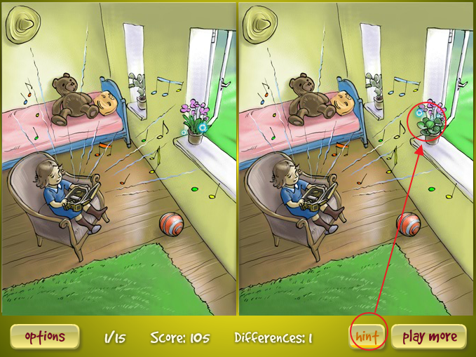 - 차이점 발견: 두 그림 사이에서 서로 다른 부분(오브젝트의 유무, 색상 차이 등)을 찾아 마우스로 클릭합니다.