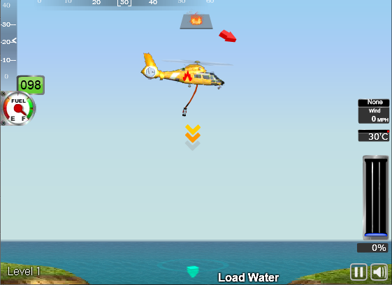 게임이 시작되면 화재가 발생한 맵이 펼쳐진다. 방향키로 헬기를 조종해 가장 먼저 호수나 강으로 이동한다. 수면 위에 낮게 호버링하면 헬기 아래 줄에 매달린 호스가 자동으로 물을 흡수한다. 물이 가득 채워지면 화재 지점으로 빠르게 이동한다.