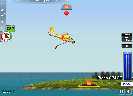 소방 헬기를 방향키로 조종해 호수 위에 낮게 호버링하면 호스가 자동으로 물을 흡수하고 스페이스바로 화재 위에 물을 투하해 번져가는 산불과 건물 화재를 진화하는 소방 시뮬레이션 플래시