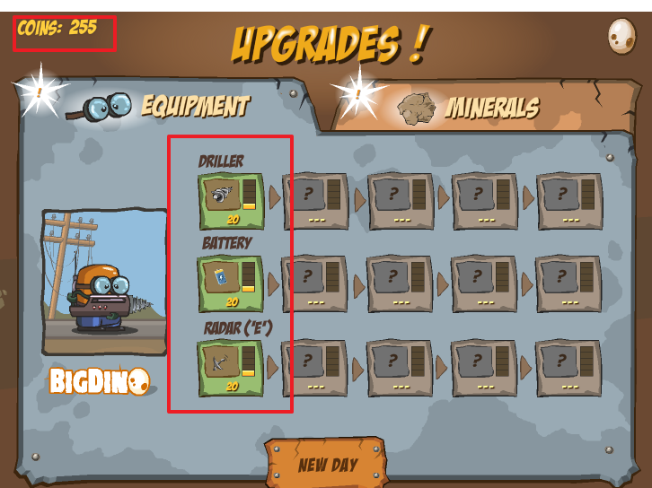 배터리나 기타 굴착기를 업그레이드를 해주면 좀더 빠르고 많이 보석을 캘수 있겠지요.