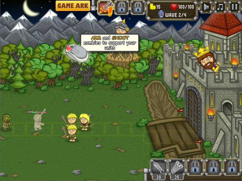 왕의 직접 공격 시스템 성 위에 있는 왕은 플레이어가 직접 마우스로 조준해 화살을 발사할 수 있다. 유닛 배치와 병행해 왕의 공격을 적극 활용하면 위기 상황을 효과적으로 돌파할 수 있다.
