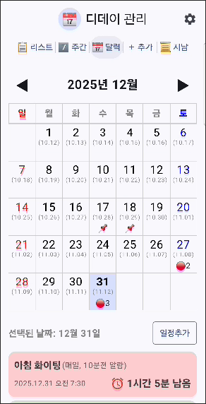 기념일은 며칠 남았는지, 음력 생일은 올해 양력으로 언제인지, 중요한 약속 시간에 알람은 제대로 맞춰놨는지. 이런 것들을 각각 다른 앱으로 관리하고 계신가요? 달력 앱 따로, 디데이 앱 따로, 알람 앱 따로 사용하면 번거롭고 놓치기 쉽습니다.