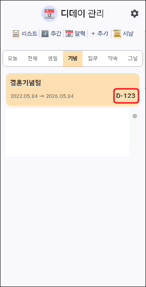 기념일 카테고리에서는 결혼기념일, 연애기념일 같은 소중한 날을 등록할 수 있습니다. 날짜를 입력하면 D-Day가 자동으로 계산되어 표시됩니다. 매년 반복 옵션을 켜두면 한 번 등록으로 해마다 자동으로 기념일이 표시되어서 매년 새로 등록할 필요가 없습니다.