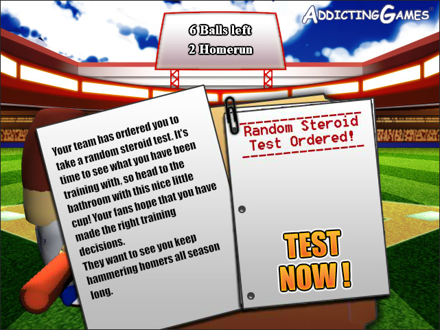 투수가 던진 공이 날아올 때 완벽한 타이밍에 클릭해야 홈런을 칠 수 있습니다. 너무 빨리 클릭하면 공을 헛치거나 파울이 되고, 너무 늦게 클릭해도 마찬가지입니다. 동시에 마우스로 배트의 높이를 조절하여 공의 궤적에 맞춰야 합니다. 공이 높게 오면 배트를 위로, 낮게 오면 아래로 움직여야 합니다. 스테로이드를 선택했다면 타이밍이 조금 어긋나도 파워로 커버할 수 있지만, 체육관을 선택했다면 완벽한 타이밍이 필수입니다. 화면에 빨간 잔상이나 타이밍 힌트가 표시되어 도움을 줍니다.