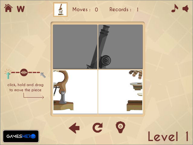 마우스로 그림조각을 드래그하면 좌우 혹은 상하로 그림이 서로 자리바꿈이 되며 이를 이용하여 하나씩 그림을 맞춰나가면 됩니다.
